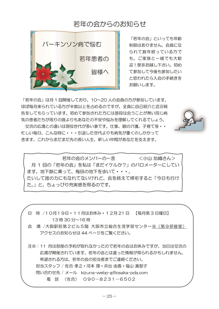 パーキンソン病で悩んでいる若年患者のみなさんと一緒に「若年の会」で悩みを相談し苦労を分かちあいませんか? きっと何かが見えてくるはずです。